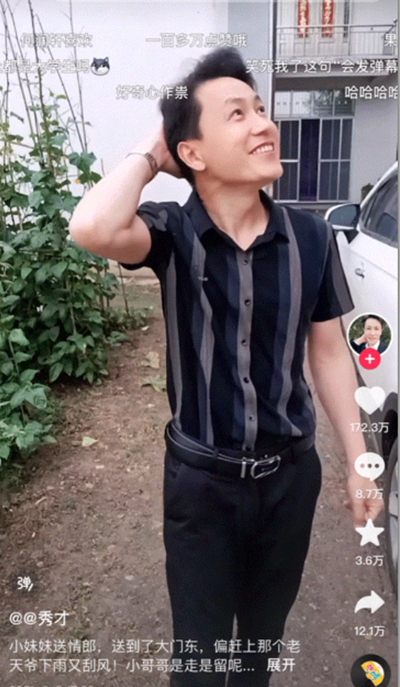 据悉,“秀才”年龄39岁,是安徽省亳州市蒙城县人,抖音网红,粉丝数超1200万,曾被称为“中老年妇女收割机”。视频里的“秀才”总是身着polo衫或西装,假装不经意看镜头,然后“羞涩”地靠近,或是唱着歌向镜头走来,仿佛和屏幕前拿着手机的人在路上偶遇、对视。之后他捂嘴、挑眉、撩发,几个动作一气呵成后,便开始对口型演唱:“爱你不是我的错,是你太美惹的祸。”