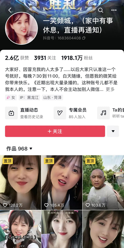面向中老年群体的短视频网红不止秀才一位,名为“一笑倾城”的抖音短视频博主的粉丝数已经达到1918.1万,获赞2.6亿。与秀才相反,“一笑倾城”的男性粉丝占比接近八成,41至50岁粉丝占比达31.84%,50岁以上粉丝占比达42.13%。