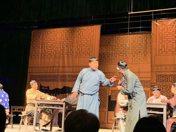在这样简约的舞台上,演员们展现了令人惊喜的群像效果。无论是72岁的李长龙、张文峰,还是47岁的暴艳庆,他们或坐或立,或埋头品茶,或三五成群地攀谈,或独自哼唱,或下棋对弈。这些来自不同职业背景的演员——书画家李沫、孟希全、魏金良,警察关德强,企业职工牛明利——都以自身的生活经验赋予了角色独特的韵味。