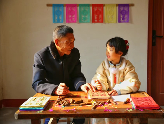来逢强向孩子传授新设计的中国年“过门笺”手工凿刻技艺