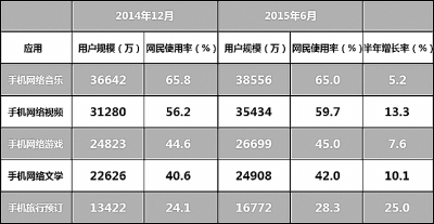 信息消费增长的亮点主要体现在两个方面:一是智能手机、智能家电以及与信息硬件相关的产品消费出现高增长;二是手机游戏、手机文学等信息内容和信息载体的消费也出现高增长。截至2015年6月,网络游戏用户规模达到3.8亿人,较上年底增长1436万人;网络视频用户规模达4.61亿人,较上年年底增加2823万人;2015年全年在线旅游市场交易规模持续增长,互联网渗透率突破10%。
