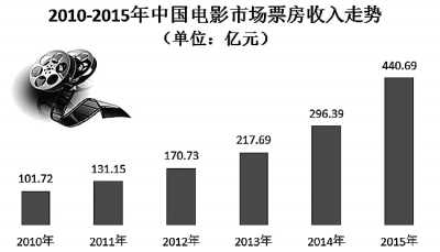 2015年,全国电影总票房定格在440.69亿元,同比增长48.7%,其中,国产电影票房达271.36亿元,占全年票房总额的61.58%。中国电影在2015年屡屡刷出新纪录——单片票房纪录从10亿元出头直接拉升到24.39亿元;票房过亿的国产片达到47部;全年有4部影片进入“10亿元俱乐部”;全国城市院线观影人次12.6亿,同比增长51.8%。
