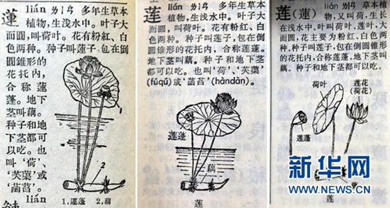 “莲”字在《新华字典》不同的版本中,解释略有微调,所配的图也有改变(拼版照片,5月13日摄)。 新华社记者 罗晓光摄