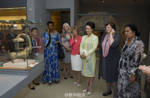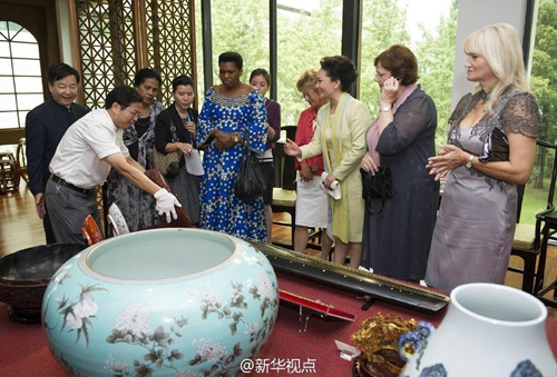 【彭丽媛陪同出席青奥会开幕式部分外方领导人夫人观赏南京博物院珍贵文物】彭丽媛16日同出席青奥会开幕式部分外方领导人夫人在南京博物院清香阁茶屋,伴随悠扬古琴声,一边品茗,一边观赏五弦古琴、如意云纹金盘金盏、大雅斋款瓷器、雕漆山水人物纹漆盒等院藏珍贵文物,领略中国古代文化。(刘华/黄敬文)