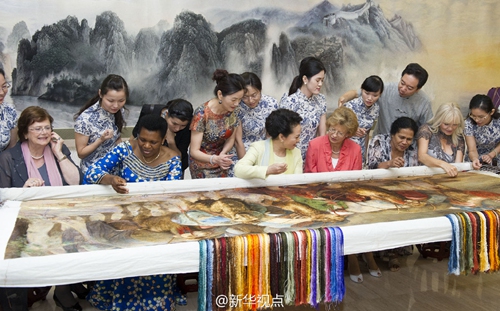 【彭丽媛和出席青奥会开幕式的部分外方领导人夫人一起尝试苏绣】彭丽媛16日同出席青奥会开幕式的部分外方领导人夫人在南京博物院观看非物质文化遗产展示时,一起坐在尚未完工的苏绣作品《丝绸之路》旁,在“非遗”传承人指导下尝试刺绣。(刘华/黄敬文)
