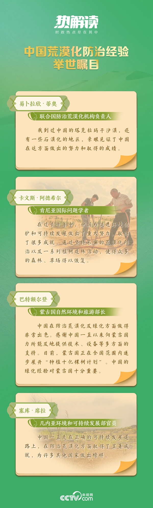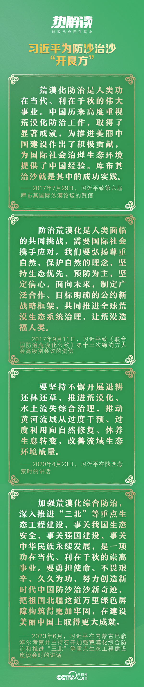 从“荒漠化防治是人类功在当代、利在千秋的伟大事业”,到“防治荒漠化是人类面临的共同挑战,需要国际社会携手应对”,再到“坚持系统观念,扎实推进山水林田湖草沙一体化保护和系统治理”……在习近平生态文明思想指引下,中国积极行动,形成了政府主导、全民参与、科技支撑、法规保障的治沙模式,取得了显著成效。