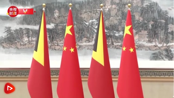 △会见现场摆放的中国、东帝汶国旗。(总台央视记者曹亚星拍摄)