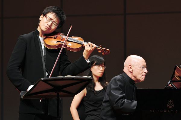 在国家大剧院2011艾森巴赫大师系列音乐会中,有一场音乐会特别有看点——8月13日,年迈的艾森巴赫携手年轻的中国小提琴家朱丹,为首都的听众献上了一台经典“索纳塔”(奏鸣曲)。这是一场含金量颇高的古典“盛宴”,两位音乐家“老少联袂”,共同演奏了四首古典钢琴与小提琴奏鸣曲,即贝多芬的《D大调第一钢琴与小提琴奏鸣曲》(作品12之1),莫扎特的《A大调钢琴与小提琴奏鸣曲》(作品526),莫扎特的《降B大调钢琴与小提琴奏鸣曲》(作品454),贝多芬的《F大调钢琴与小提琴奏鸣曲》(作品24“春天”)。