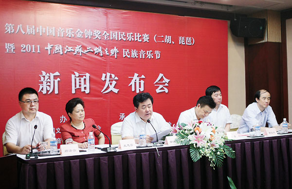 9月9日,第八届中国音乐金钟奖民乐比赛暨2011中国江苏民族音乐节新闻发布会在京召开。由中国文联、中国音协、江苏省委宣传部和江苏省文联主办,江苏省文联、江苏省演艺集团和江苏省音协承办的第八届中国音乐金钟奖民乐比赛暨2011中国江苏民族音乐节将于10月8日至14日在江苏南京和无锡举行。中国音协分党组书记徐沛东、江苏省文联党组书记王慧芬分别在会上讲话。