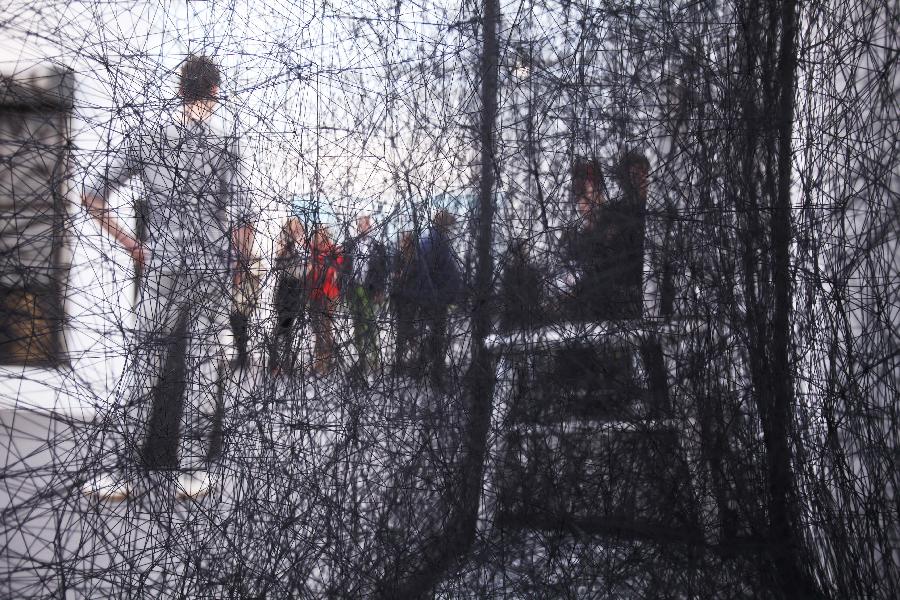 透过一件展品拍摄的观众在法国巴黎大皇宫参观第39届巴黎国际当代艺术博览会(10月18日摄)。当日,第39届巴黎国际当代艺术博览会(FIAC)在巴黎大皇宫展览馆举行,共有来自24个国家的182家画廊参展。巴黎国际当代艺术博览会诞生于1974年,原名巴黎当代艺术国际沙龙,每年10月在巴黎举行。(新华社记者 高静 摄)