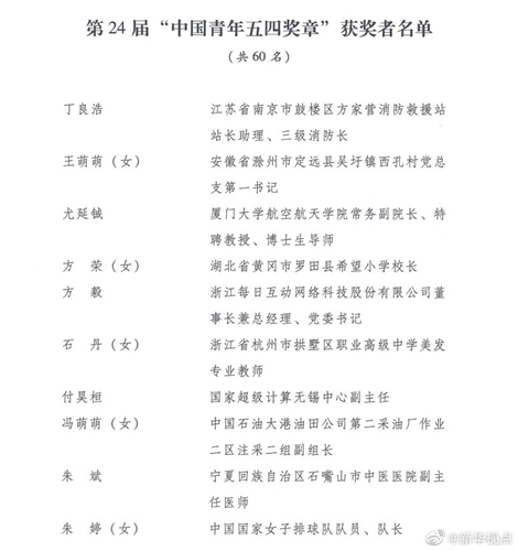 新华社北京4月28日电 在五四青年节来临之际,共青团中央、全国青联共同颁授第24届“中国青年五四奖章”,表彰青年中的优秀典型和模范代表。决定授予丁良浩等60名同志第24届“中国青年五四奖章”,授予北汽福田国庆70周年群众游行彩车底盘制作和技术保障团队等34个青年集体第24届“中国青年五四奖章集体”,追授王烁等34名同志第24届“中国青年五四奖章”。
