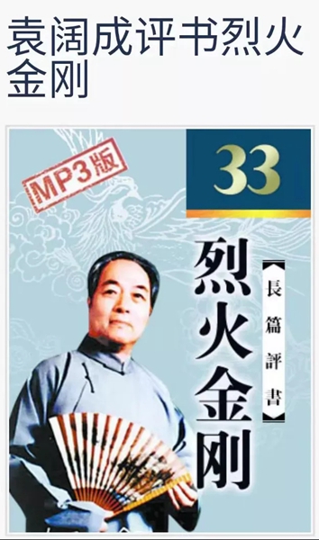 后来,随着广播电台的普及,《烈火金刚》又被我国著名的评书表演艺术家袁阔成先生改编成了长篇评书,它变得更加切近人们的生活了。不论是城镇的大街小巷,还是乡村的田间地陇,凡是有收音机或者大喇叭的地方,就有人趴在“电匣子”前,或是尖着耳朵,听“肖飞买药”,听“丁尚武耍大刀”,听“史更新死而复生”。