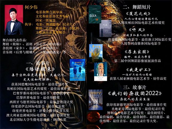 11月23日,“舞蹈与电影相遇——何少伟舞蹈影像与电影作品交流放映”在北京市铜牛电影艺术空间举行。活动展映了何少伟的两部故事片作品《陪你醒来》《我们的杂技团2022》和4部舞蹈短片《莲花之处》《听风》《厚土家园》《我是矿工》。这些作品赢得国际电影界的肯定并荣获了不少国际奖项,这是第一次在国内公开放映。