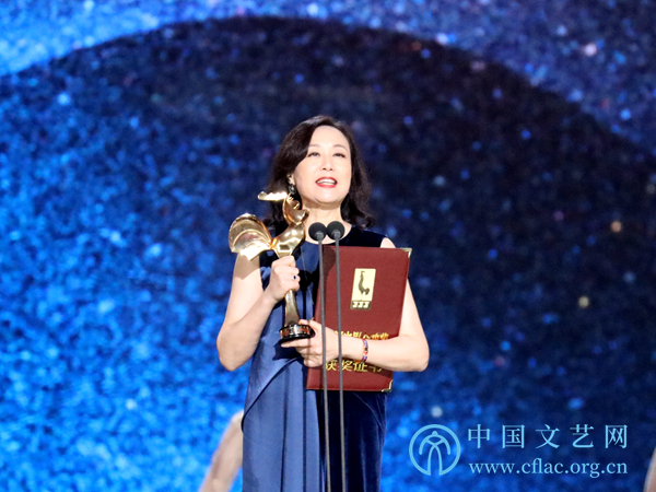 11月23日,第32届中国电影金鸡奖颁奖典礼暨第28届中国金鸡百花电影节闭幕式在福建厦门举行。图为最佳女主角咏梅(《地久天长》中饰王丽云)发表获奖感言。