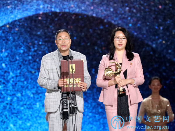 11月23日,第32届中国电影金鸡奖颁奖典礼暨第28届中国金鸡百花电影节闭幕式在福建厦门举行。图为最佳美术屠楠、陆苇(《妖猫传》)发表获奖感言。