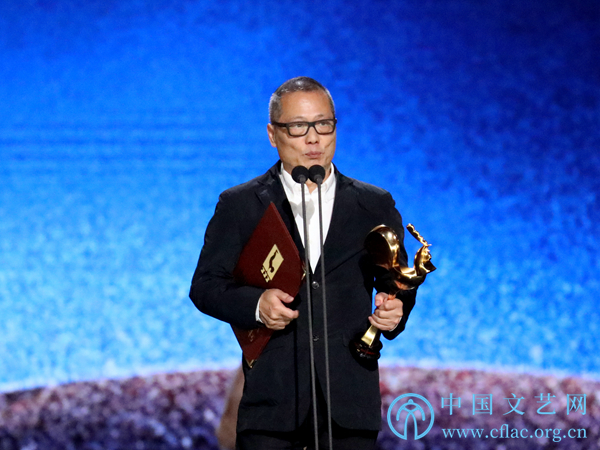 11月23日,第32届中国电影金鸡奖颁奖典礼暨第28届中国金鸡百花电影节闭幕式在福建厦门举行。图为最佳导演林超贤(《红海行动》)发表获奖感言。