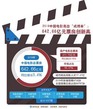 新华社北京12月31日电 国家电影局31日晚发布数据,2019年中国电影总票房642.66亿元,同比增长5.4%;国产电影总票房411.75亿元,同比增长8.65%,市场占比64.07%;城市院线观影人次17.27亿。2019年新增银幕9708块,全国银幕总数达到69787块。