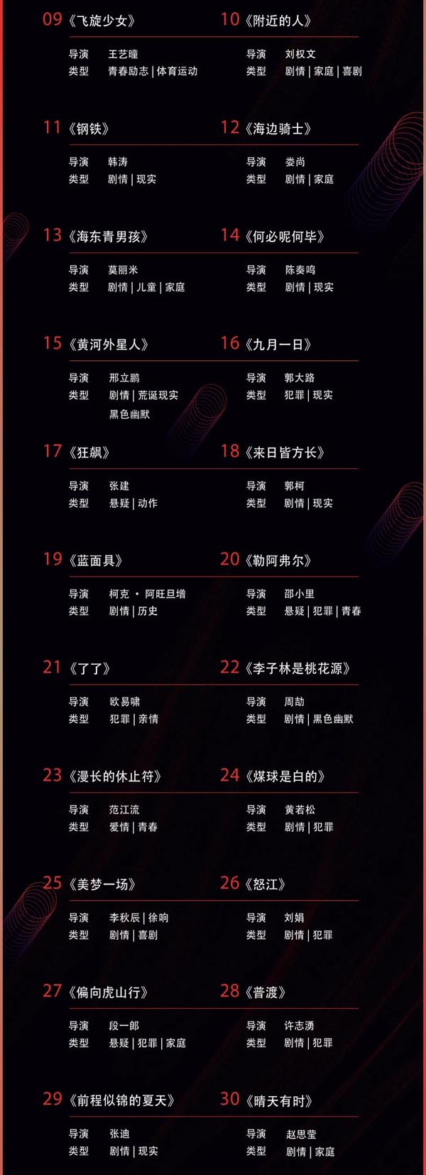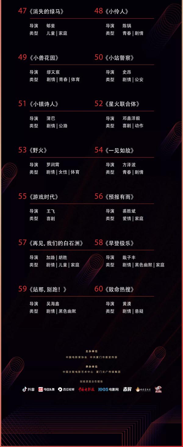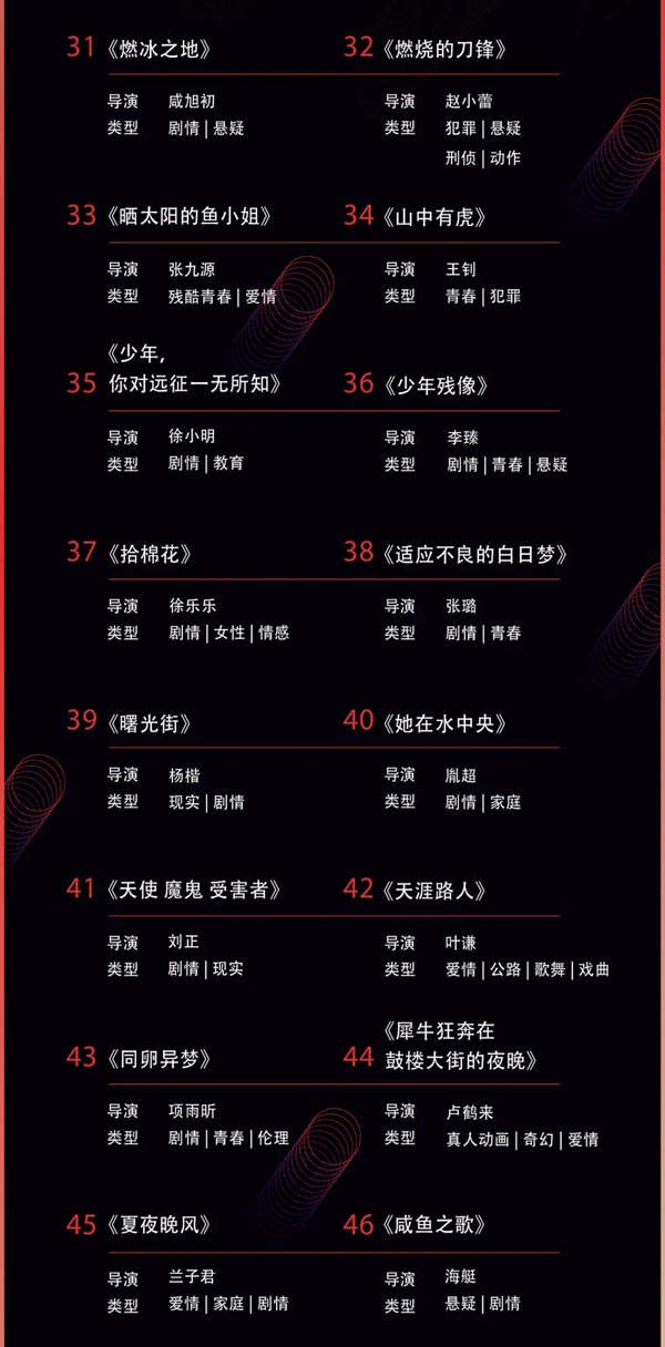 本届金鸡电影创投大会初审工作自7月中旬启动,共邀请12位专家及业界评审,分为四组对937件有效项目进行交叉评审,最终评选出60件入围复审项目,以确保所有项目得到严谨、客观、专业的评审,保证所有优质作品能够到达资方层面。接下来就和小编一起来看看今年的入围复审项目名单吧~