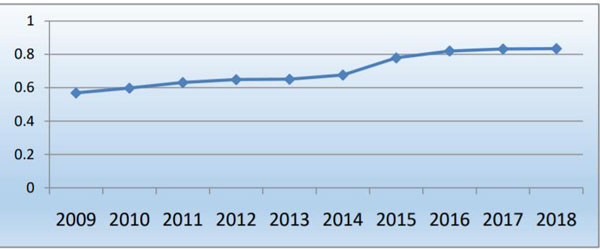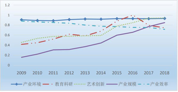 图 2 中国电影产业分项指数(2009-2018)