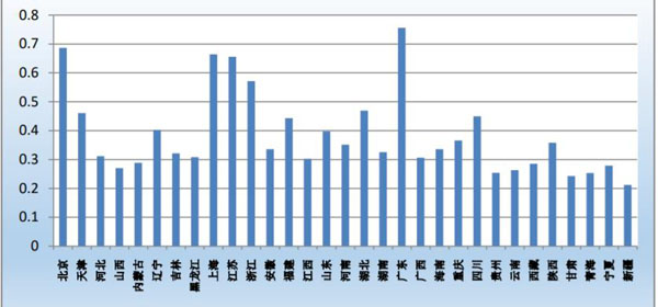 (三)中国 31 个省(自治区、直辖市)电影产业指数从 31 个省(自治区、直辖市)的电影产业综合指数看,广东第一,北京第二,上海第三,江苏第四,浙江第五。和前几年的指数比较,前几名的排序变化程度不大,广东、 北京、上海、江苏和浙江一直位居前 5 名,只是北京和上海在二三名的位置上波动,浙江和江苏在四五名的位置上波动。各地均越来越重视电影产业,北京、上海、浙江、广东等地都出台了诸多的促进电影产业发展的政策文件,对当地的产业发展起到显著促进效果。
