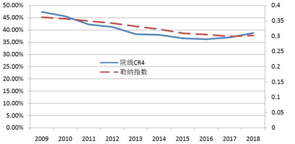 图 5 中国电影产业贝恩指数与勒纳指数(2009-2018)