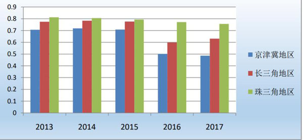 图 4 三大经济区电影产业指数(2013-2017)
