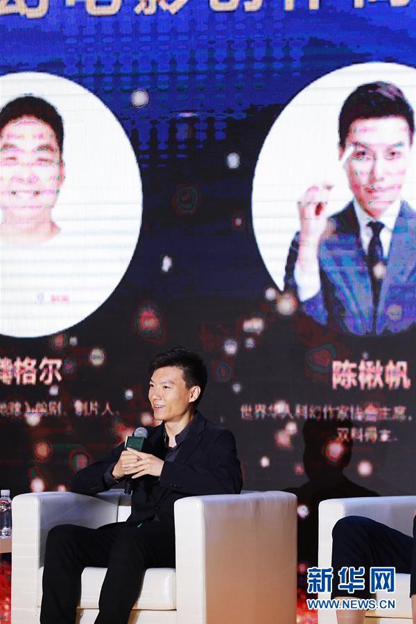 9月26日,科幻作家韩松(左)在郑州举行的中国科幻电影创作高峰论坛上发言。 新华社记者 任沁沁 摄