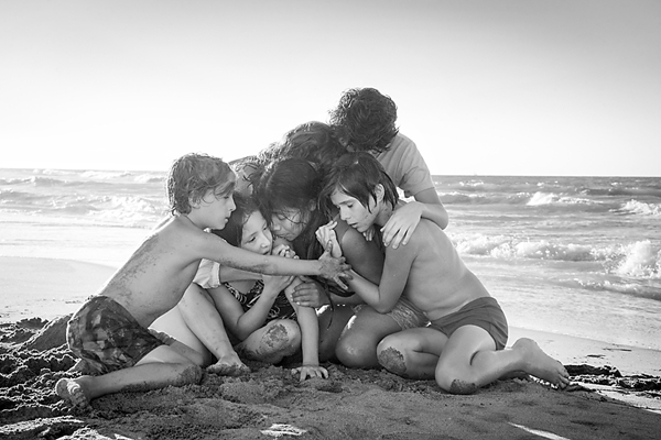 除了这种场面调度上的炫技,影片的奇观还表现为极力追求唯美效果的仪式化场景,最典型的就是临近结尾处的海滩长镜头段落:逆光背景下,刚刚救下孩子的克莉欧和女主人一家在海滩上紧紧拥抱在一起,完成某种阶级融合的表意和对女性苦难的悲悯,观众对人物的共情也在这样的唯美效果中得以升华。然而,卡隆在导演访谈中表示,这个镜头是后期合成的,先后拍了两个镜头,一个有演员表演,一个调低亮度用空镜头捕捉合适的日光背景,然后再数字合成,以避免背景高光引起过曝,导致前景的表演细节丢失。长镜头美学的要旨本在于时间维度上的真实记录,卡隆一味追求唯美效果显然已经与此背离。