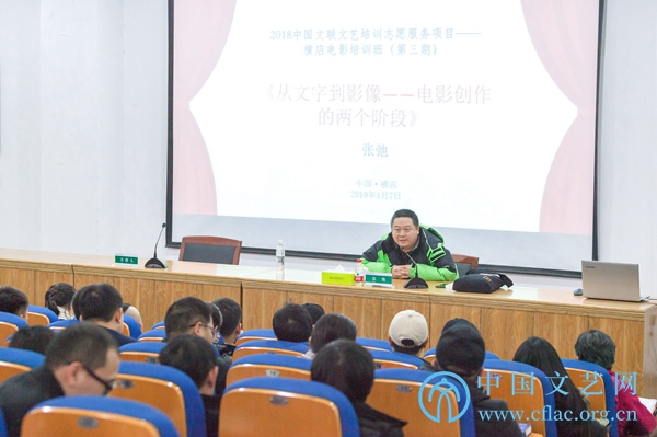 1月6日至8日,“2018中国文联文艺培训志愿服务项目——横店电影培训班”(第三期)在浙江横店举行。图为导演、编剧张弛讲座现场。