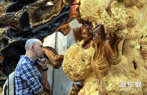 10月6日,一名外国观众观看展出的根雕作品。新华网图片 韩传号 摄