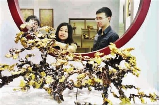 图为观众在精品展上欣赏中国工艺美术大师朱炳仁创作的融铜雕塑作品《虬髯》李忠 摄影