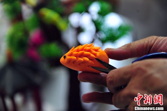 7月29日,陈化勤老人在认真制作“面塑”刺猬。中新社发 于海洋 摄