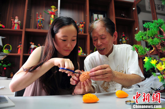 7月29日,陈化勤老人在教热爱中国传统民间艺术的年轻人做“面塑”。中新社发 于海洋 摄