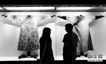 据介绍,与时下宫廷剧中服饰不同,真正的清宫服饰大多以江南三织造即江宁织造局、苏州织造局和杭州织造局生产的优质丝织品为面料。其中工艺最复杂的是龙袍,绣织运用了齐针、套针等10多种针法。有史料记载,为皇家织造一件龙袍,需用绣匠608工、绣洋金工285工、画匠26工。一件龙袍上绣有40多条龙。加工一件清帝龙袍需要千人制造,如用一个人来刺绣,要用两年零五个月才能把花纹绣完。