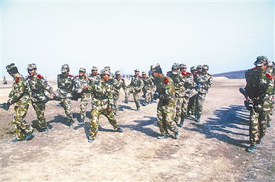 连日来,驻疆武警8664部队利用训练间隙广泛开展丰富多彩、寓教于乐的文化活动,营造快乐训练的浓厚气氛,激发官兵精武热情。图为战友们在训练间隙进行“同舟共济”团结协同游戏的一个镜头。