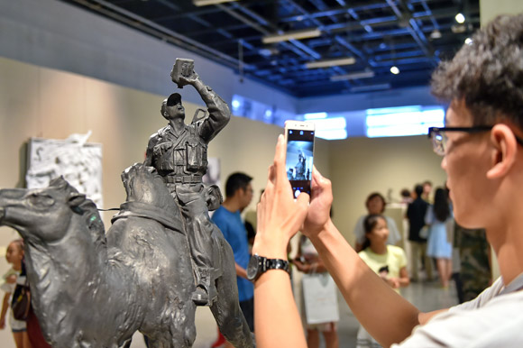 开展首日,展览现场就迎来了大批观众。其中既有艺术界的专业人士,更多的是慕名而来的市民和假期中的大中小学学生。许多观众是第一次近距离接触到当代军旅雕塑,他们在雕塑前久久驻足,拍照留念。许多家长带着孩子前来接受爱国主义教育,感受雕塑艺术的魅力。