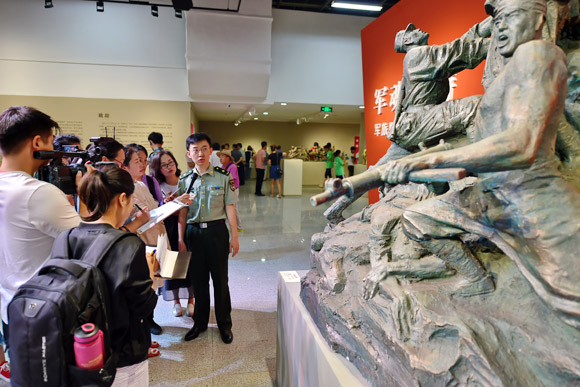 图为军旅雕塑家向记者和观众介绍作品。曹阳 摄