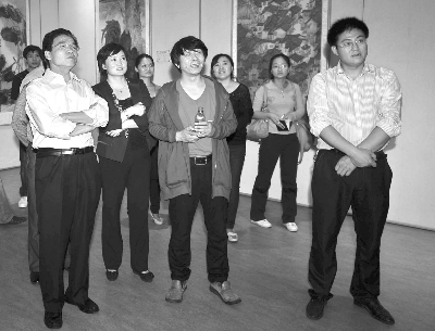 县委书记王正风(左一)、县委常委政法委书记孟力(右一)、县委常委宣传部长王红梅(左二)观看芮城永乐宫书画艺术节作品展 肖永杰 摄