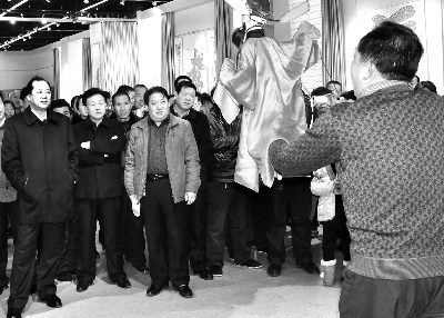 县长董旭光(左一)、县文广新局局长苏民武(左三)观看非遗展示 李耀光 摄