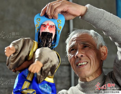 2013年3月6日,浙江省新昌县东茗乡后岱山村的王焕均同平时一样开始检查整理布袋木偶,为新编布袋木偶廉政戏《清风岭》进村巡回演出做准备。