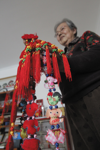 让人称奇的是,韩月娥老人不仅能把各种传统节日饰品做得很全,还能把每件饰品的寓意说得清清楚楚。“我做了一辈子这些小玩意儿,我妈也做了一辈子,我姥姥也做了一辈子,加起来有140多年了。”韩月娥说,她的姥姥王宋氏是庄河仙人洞远近闻名的巧匠,她在细陶器上画的民俗画栩栩如生;她的母亲王润芝是庄河桥东有名的巧媳妇,最擅长针线活儿。她的这两位长辈都活到90多岁才去世,而她的母亲生有7个女儿,这7姐妹个个手上都有剪纸、布艺等传统手工绝活。