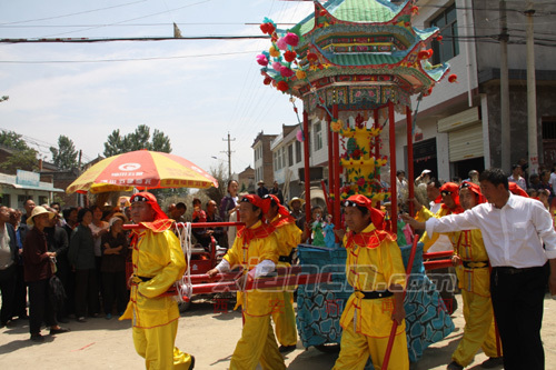 第二天,村民发现关帝庙里供奉的关老爷木像汗流浃背还丢了一只鞋,立即把关羽奉为保护神。那天正好是四月初八,此后村里就有了‘四月八,游大蜡’的说法。”