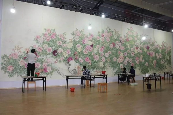 上合组织青岛峰会迎宾画《花开盛世》创作现场