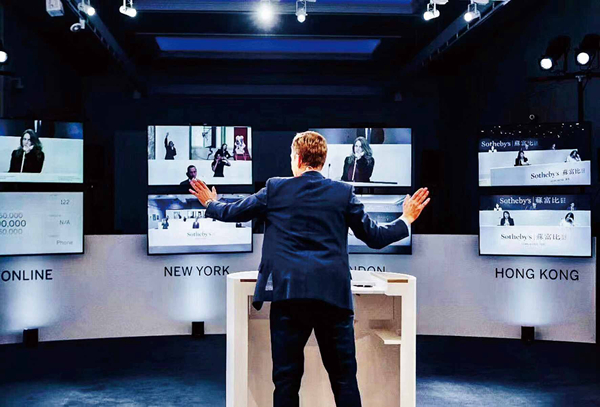 北京时间6月30日, 拥有276年历史的苏富比在“云端”串联起纽约、伦敦、香港3个拍场,收获3.63亿美元。同时面对8块大屏幕阅读报价的苏富比欧洲区主席、拍卖官奥利沃·巴克说:“站在拍卖台上,感觉有如置身电影场景之中。”当天,纽约苏富比在其印象派&现代艺术、当代艺术及金妮·威廉斯珍藏三个专场拍卖中,首次采用了“全球视频连线+电话报价+网络及书面竞标”的方式竞拍并大获全胜,其线上销售总额与去年同期相比增长976%。这一史无前例的操作尽管称不上科技含量十足,但它重塑了拍卖的流程,昭示了拍卖模式的新开端。随后的7月10日,拍卖业另一巨头佳士得也带来了更具形式感的“ONE:现当代全球联合夜拍”。它利用网络直播,史无前例地将香港、巴黎、伦敦、纽约不同时区的四大重要拍场置入同一时段内进行接力拍卖,这也是佳士得254年历史上首次联动全球4座城市。4.21亿美元的成交纪录不仅刷新了拍卖史,这一极具创新性与实验性的云操作,也因精彩有趣且“超长待机7小时”,被业界戏称为“艺术界春晚”。在佳士得中国区总经理胡伟爔看来,此场“夜拍”完美展现了艺术品拍卖科技创新化、现当代艺术品收藏全球化、专家团队支撑以及拍卖官集中发力的新时期特点。而佳士得行政总裁施俊安也表示:“这种混合形式的概念拍卖是调整创新的一种方式。”