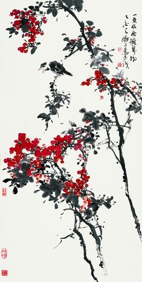 衡量一个大写意花鸟画家的真正标准不是在题材上他画了什么,关键是:怎样来画,笔墨功夫上,在美术语言上他走到了何处?具备了美术知识之后,是否诞生了纯美术表达的智慧?在流通的商品社会中他是否将自己的艺术思维酿出了醇酒,产生了可以与他人沟通和交流的可能?沉植于每一个中国人内心的审美习惯,在他的笔下,体现了多少,拓展了多少个性化的符号,结构是否准确明晰……