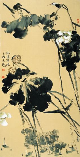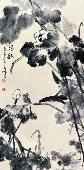 抽象符号的千锤百炼产生了画面本身的美感,演绎出的现代水墨韵与趣,变为荷,成为花,点缀鸟,绝无一张纯抽象的作品,无意于佳的线,扩大成面,产生出厚重的体积,整合出形式美的杼机,纯美术的语言又绝对是雅俗共赏,不尚丑怪。拿出任何一个局部又是真正的现代绘画;荷塘里无意识的墨点,犹如美国画家波洛克的抡洒,淡墨的整体衬托让人联想到印象派对光的运用,几幅方整的静物画里面全是徐渭疯人一样的运笔,雅静中的豪迈与热情使黑白的水墨加上了五彩和光,徐渭与梵高仿佛在寂然中掩映。