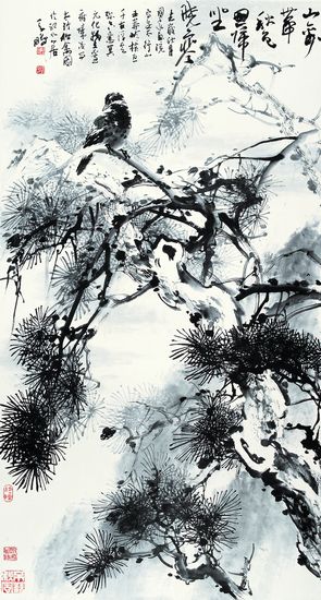韵味,是画面的内涵,只有技巧熟练到可以达到的潜意识、下意识的程度,才可以言其妙道而后自然产生的绘画行为结果。对此把握与追求者是真画家,悬之于壁,一咏三叹,反复观之而不生厌倦,笔墨节奏和黑白的二维空间可以诞生高山流水的回响,墨色的层次已不是焦湿渴淡浓的五色,任何一个准确的形象即此即彼,是画面的成分,又非眼所指向,是师造化、法心源的大境界。赏陈鹏画知其味者先在体会其韵,以此发微。