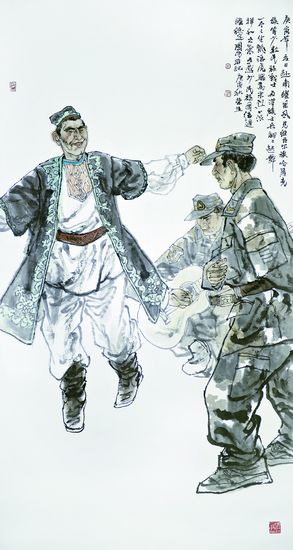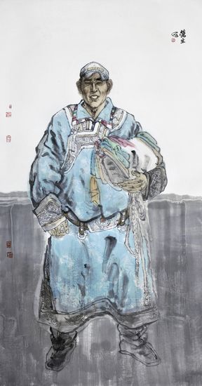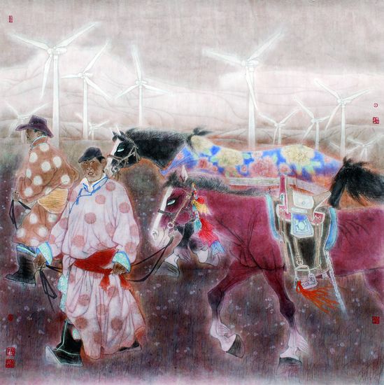 他画出了风雪中的人与马,笔墨间隐藏着默默挣扎的力量;他画出了草原上的妇女褐红色的衣衫与灰蓝的鸢尾花互相映照,有一种苍凉的妩媚;他画出了山岩深垂、大江平展的辽阔空间,在草原上,迂迴的小路是牧民在不同的时间从不同的方向里留下的足迹。引导后来者一步又一步地走向那坡顶高处的敖包。