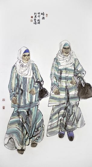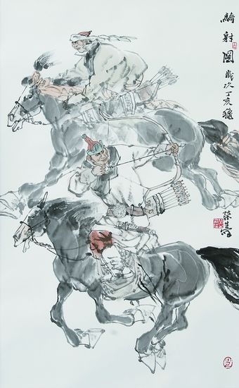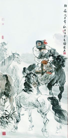 细读周荣生的作品,不论是表现草原风情还是高士丽人,给我们最深刻的印象是:画家获得了艺术上的自我超越与升华,笔墨间的情感更为浓烈、精神视野更为达观,形式的朴拙寓意着睿智,意象野逸却又澄明纯净。画面中飘逸着自信与超凡的气息,章法结构自然天成,绝少刻意的成分,情感的体验、笔墨的率意与情怀的直抒,意识的流动和着笔的率性游移、墨的随意挥洒,借助艺术的幻觉与联想,在笔墨与点线之间饱含情思,处处寓意,景情一体,都表明周荣生的作品诞生了真正意义上的个性化的艺术风格与艺术手法。在笔墨间寻找自我的存在,使他的作品具有一种别样的美学意味和价值,从容地体现出画家的阅历、修养、品格、气质。