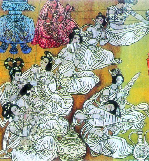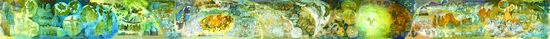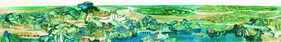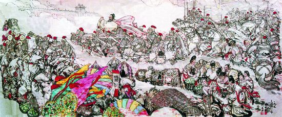 ◎ 赏析4:《丝绸之路》,这是一铺宏伟的壁画,起源于他1985年的丝绸之路考察,但是融入了丰厚的历史知识,中西古来的视觉图像,特别是注入了瑰丽的想象。全图描绘从长安到罗马的一路风光,400多个人物姿态迥异,神采不同,建筑车船、动植物、服饰环境,千变万化,丰富多彩。有古典乐舞的典雅,民族舞蹈的热烈,飞天的飘逸,商贸交易的喧闹,异域风情的奇幻,民间传说的神奇,图腾文化的诡谲,宗教文化的神奥,耕耘狩猎的生气,还有海上丝绸之路的船队。他以包罗万象的大手笔,概括了中西交流的历史,又以中国汉唐壁画传统为主体,整合了中西古今画法的绚烂,有实有虚,有特写,有穿插,步移景换,情随境生,光辉随光环不断扩展,诗意在缤纷流动中闪光。有隋唐的灿烂、西域的绚丽、波斯的细密、写实的凝重、装饰画的奇妙。这幅宏伟壮阔的作品,是漫长年代的重叠,是东西跨度的浓缩,概括了中西交流的生态,古人说“笼天地于形内,挫万物于笔端”,杨晓阳说“汇时空之长风,拂意象之摇动”,确实,此画分量重而气韵活,可以说是一曲丝绸之路雄浑壮丽的交响诗。